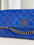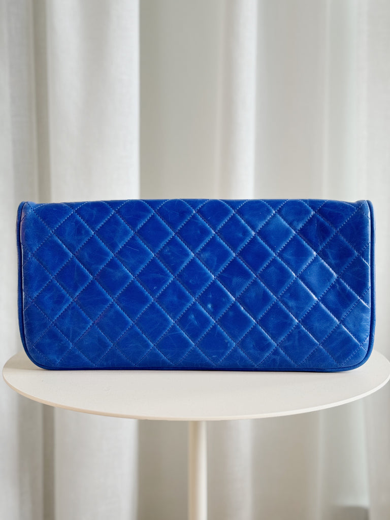 Blue Glazed Calfskin Quilted Chain Clutch Bag by Chanel. From the Spring 2013 collection. Featured antiqued silver-tone hardware and a snap closure at front that opens to grosgrain lining and a zip pocket at the interior wall. Includes authenticity card and dust bag. Excellent condition.