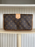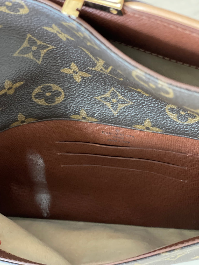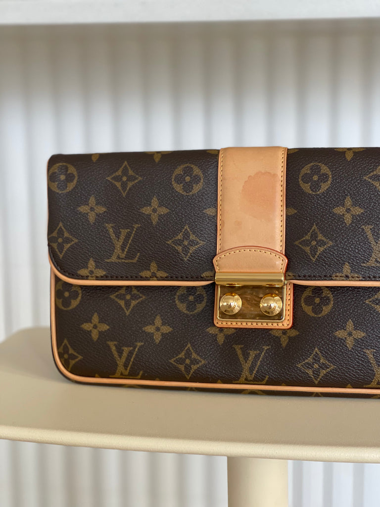 Sofia Coppola Monogram Clutch by Louis Vuitton. This slim clutch is made from brown coated canvas, features brass hardware and a push lock closure at front. It opens to Alcantara lining with three card slots. Some signs of wear: mark on the leather at the front and white marks at the interior (shown in photographs).