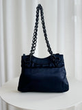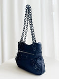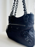 Black Satin Motocross Classic City Mini Bag by Balenciaga. Features black hardware, chain-link shoulder straps and a single exterior pocket. The top zip opens to satin lining and a pocket at the interior wall. Excellent condition.
