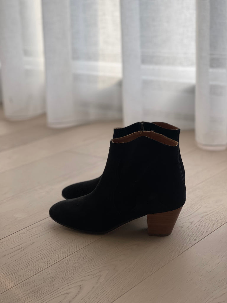 Black Dicker Suede Ankle Boots by Isabel Marant. Isabel Marant has been championing cowboy boots for years, and these 'Dicker' boots are proof. They feature subtle frontier-inspired stitching and a 2.25" heel. Includes original box and dust bag. Currently still available to shop in stores.