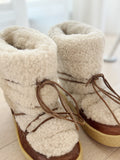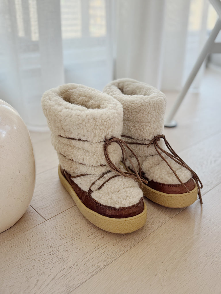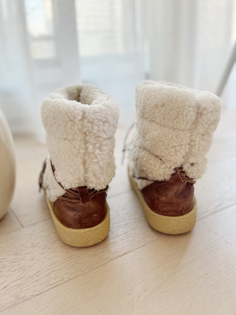 Off-white Zimlee Shearling Snow Boots by Isabel Marant. They feature a lace-up closure, a logo-embossed leather trim and a rubber sole. There are some signs of wear on the leather trim. Includes original box.