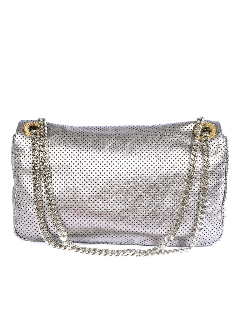 Gunmetal metallic perforated leather flap bag with gold and silver-tone hardware, silver-tone bijoux chain strap, satin lining, two interior slip pockets, interior zipped wall pocket and mademoiselle lock closure. Comes with the original box, duster, certificate of authenticity and receipt. Serial number reads 11907857.