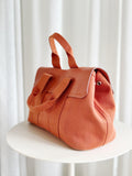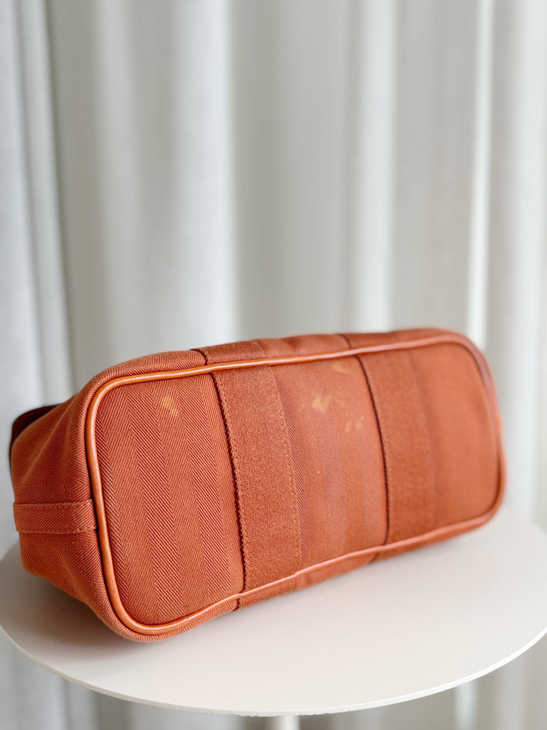 Orange Toile Valparaiso PM Top Handle Bag by Hermes. Made from potiron toile chevron, this bag features palladium-plated hardware, a leather trim and flat handles. The flap closure at front opens to canvas lining and a single interior pocket. The bag is in excellent condition besides the marks at the base of the bag (shown in the photographs).