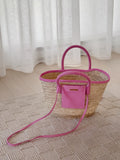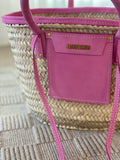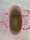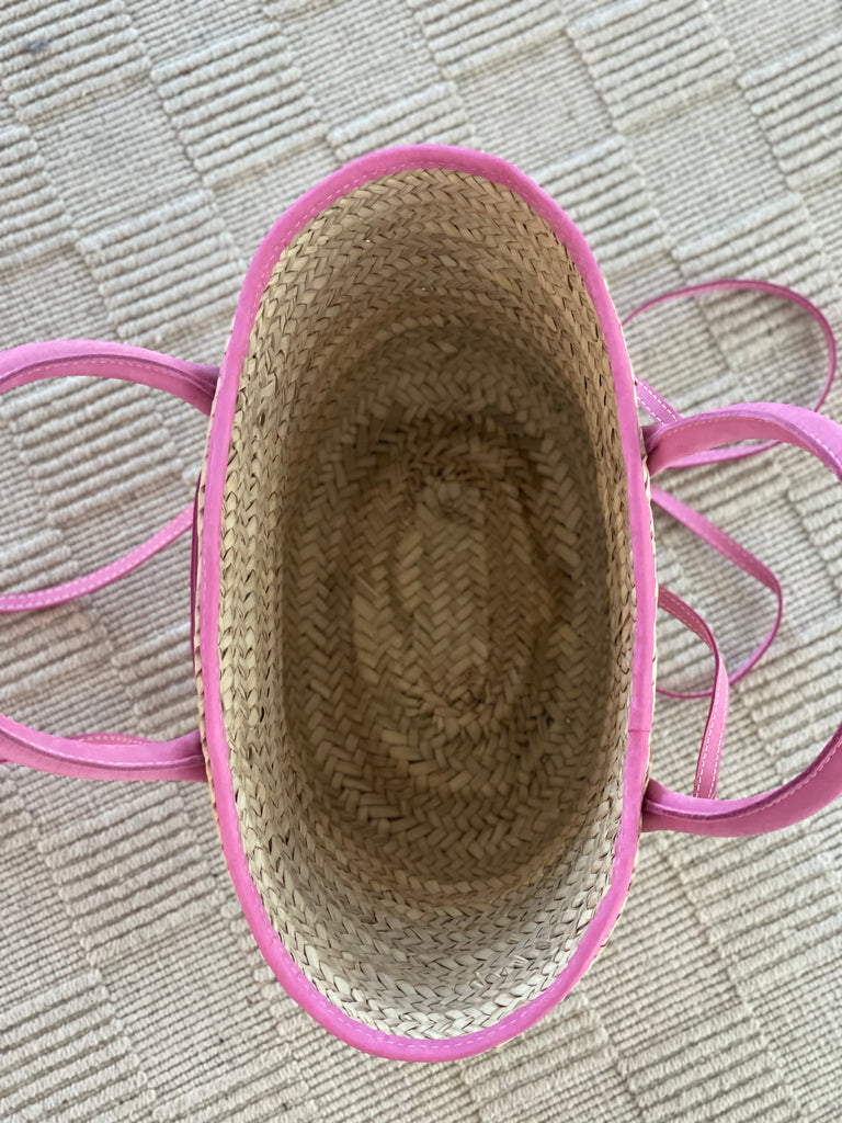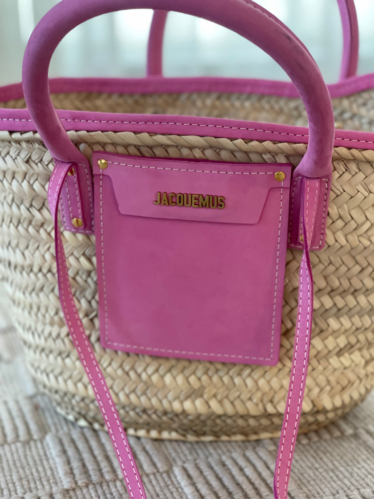 Pink Le Panier Soleil Basket Bag by Jacquemus. This hand-woven palm leaf tote in beige features a buffed leather trim in pink throughout, twin rolled carry handles with press-stud fastening, fixed shoulder straps, a patch pocket and logo hardware at face and contrast stitching in white. Excellent condition besides a minor black mark on the handle.