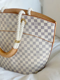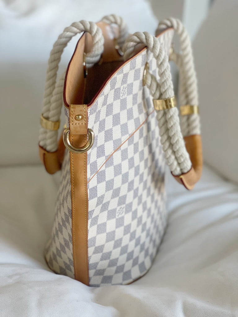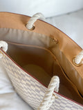 Damier Azur Pampelonne GM by Louis Vuitton. From the brand's 2007 Cruise Collection. Features a leather trim, double rope handles with leather and golden brass rings with engraved 'Louis Vuitton'. The spacious interior features four large flat pockets and a zip pocket to hold all of your essentials. A perfect companion on your resort vacation or any summer afternoon.The bag is in overall excellent condition with some natural signs of wear at the leather handles and minor signs of wear on the leather piping at the bottom corners.