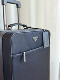 Black Nylon and Saffiano leather trolley on wheels by Prada. Features four 360° wheels at base, single pull handle at top, single retractable handle at top, single zip pocket at exterior and single zip pocket at interior. It opens two a two big compartments with logo jacquard lining; one with a zip closure and one with two adjustable leather straps. Includes luggage tag.